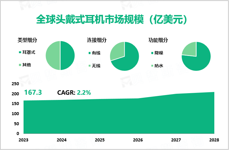 随着音乐产业、移动技术和互联网使用的不断扩大,改善声音体验在消费者中越来越受欢迎,头戴式耳机需求迅速增长。2023年全球头戴式耳机市场规模为167.3亿美元,预